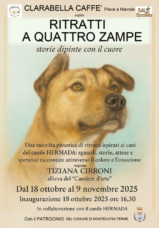 From Oct. 18 to Nov. 9, the Pasticceria Clarabella in Pieve a Nievole, in collaboration with the Hermada Kennel, will host the painting exhibition “Four-legged Portraits. Stories painted with the heart” curated by painter Tiziana Cirroni ( a student of Laura Correggioli’s Cantiere d’Arte), who has turned her passion for four-legged friends into “art.”