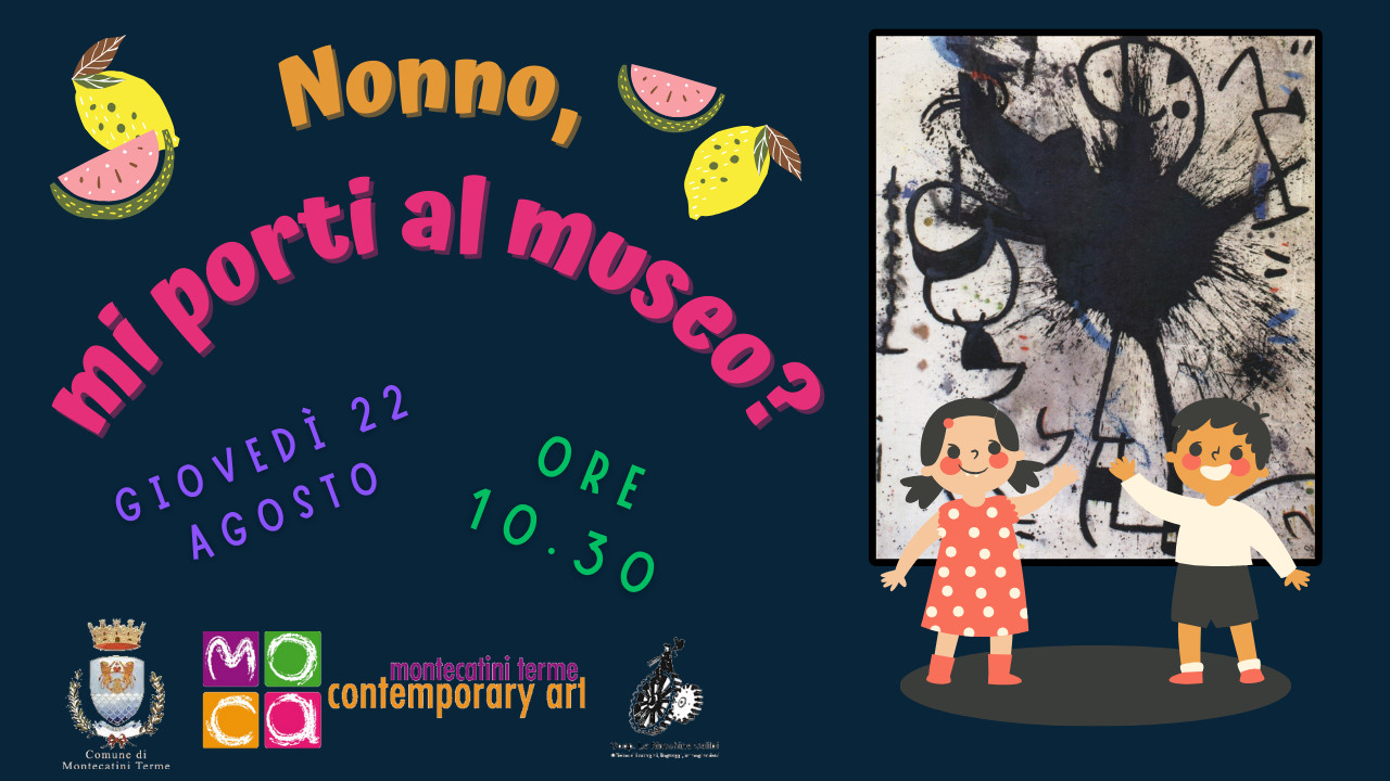 A guided tour with workshop dedicated to grandparents and grandchildren. Thursday 22nd August 2024 ️ Workshop for children aged 5 to 10 – Participants: min 5 – max 15 ⏰ 10.30 am Booking by 11.00 am on Wednesday 21st August 2024 €4 per participant For info and reservations: Mo.C.A. Ph.: 366/7529702 (from Tuesday to Friday 10.00-12.00, every Saturday and Sunday 10.30-12.30/4.00-7.00 pm) Email: mocamct@gmail.com Culture Office Ph.: 0572/918299 (Monday – Friday 9.30-12.30/Tuesday and Thursday also 3.00-5.00 pm) E-mail: cultura@mct.it We are waiting for you! Mo.C.A. Staff