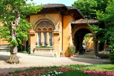 The floor, by Chini, also features spiral and geometric decorations with the Fortebraccio symbol, recalling the Schmitz family coat of arms. The Tamerici spa was recently redeveloped by the Incanto Liberty Association. Inside, musical events, exhibitions, and presentations are held, as well as the opportunity to visit the wonderful Art Nouveau “mescita” hall.