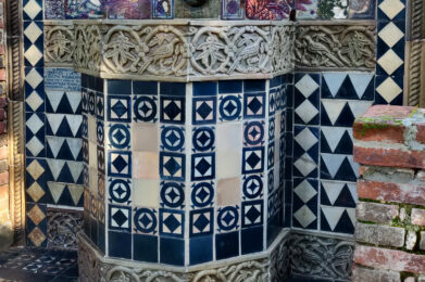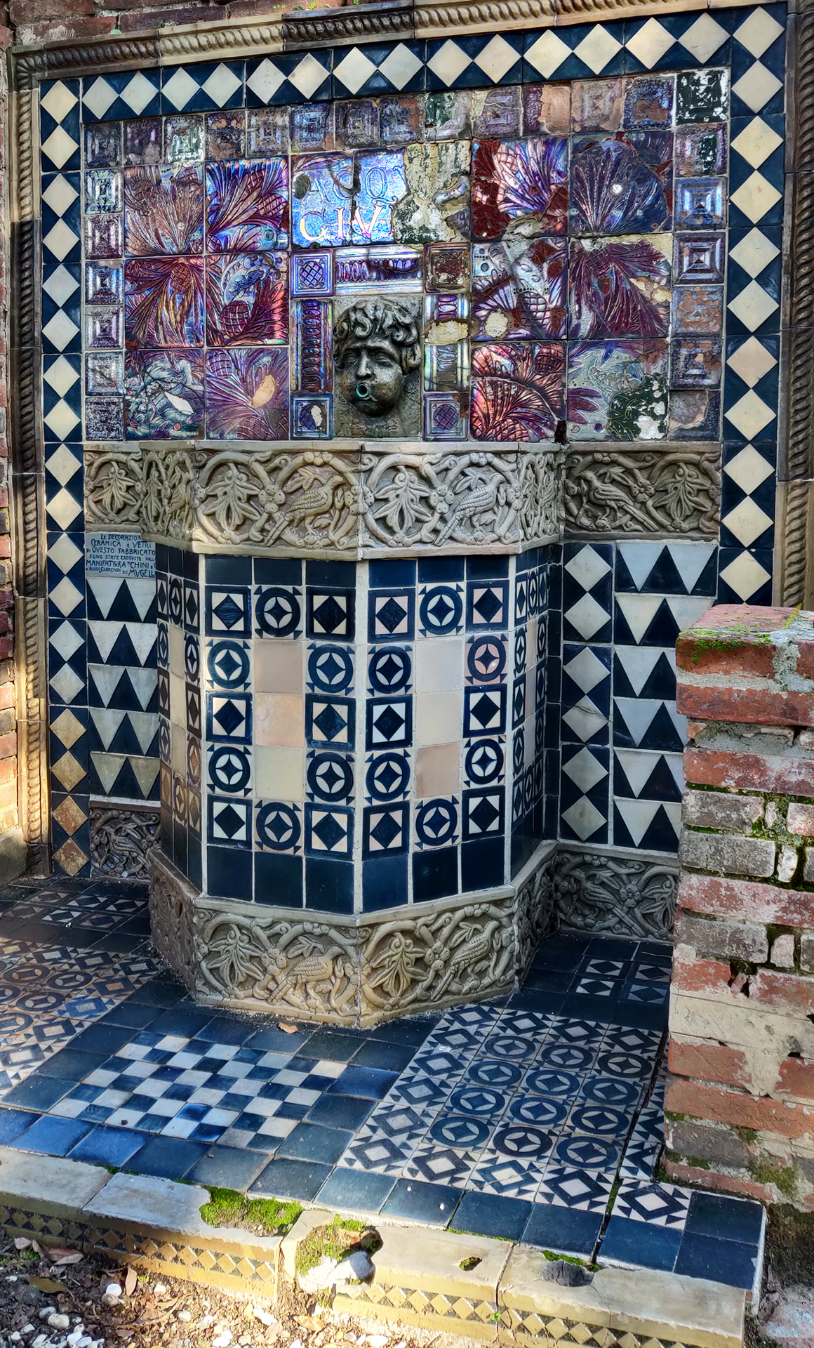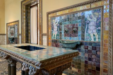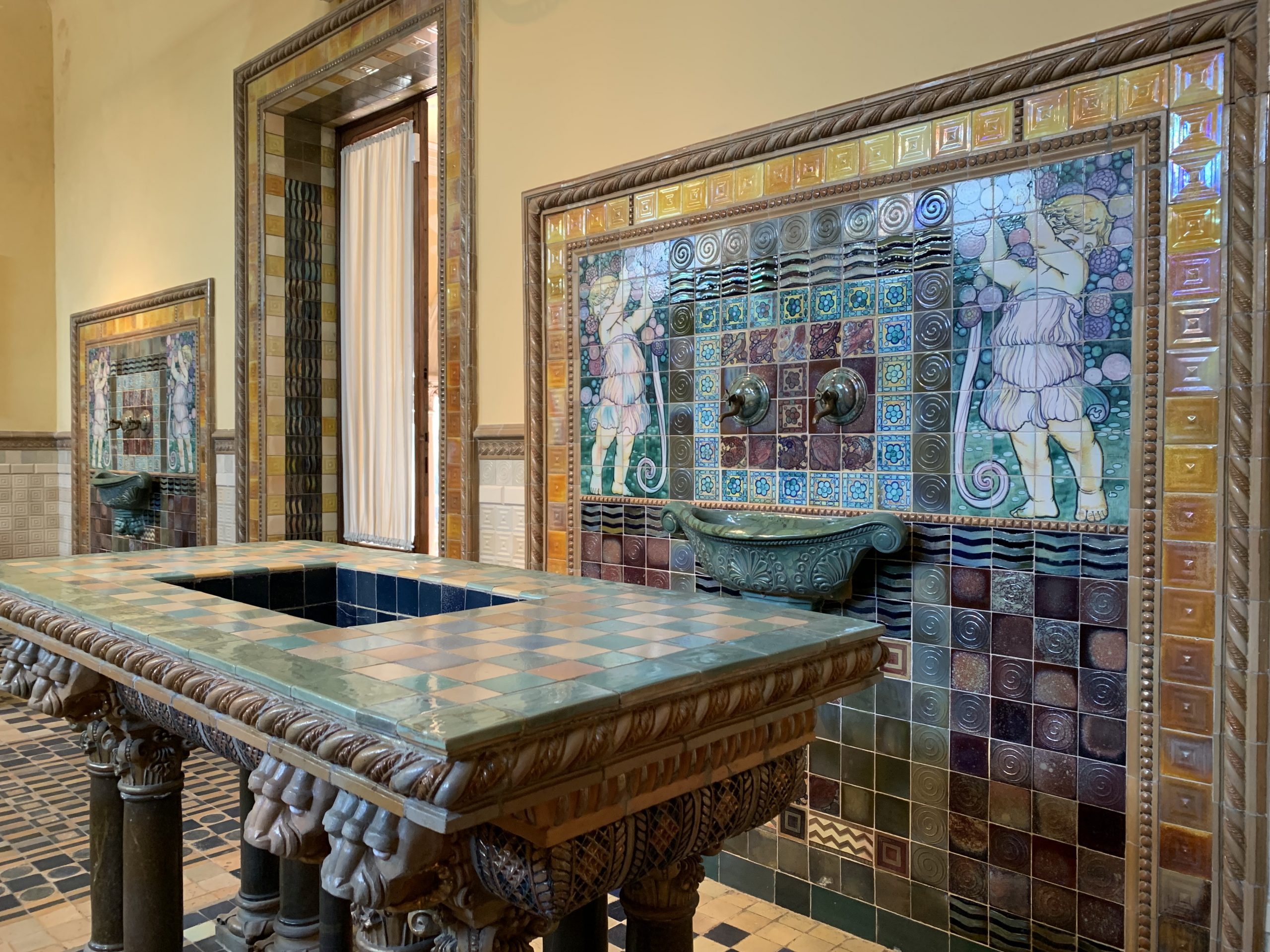 The restoration work took several years to complete, and the building was finally inaugurated in 1911. The hall of the “mescita” (water pouring) is decorated by the works of Galileo Chini created at his factory “Manifattura delle Fornaci di San Lorenzo”. Polychromatic glazed ceramic panels cover the benches dedicated to the drinking of water, depicting fish and birds alternating with flowers and geometric interlacing. They are supported by columns with lion heads, and two putti holding a festoon.