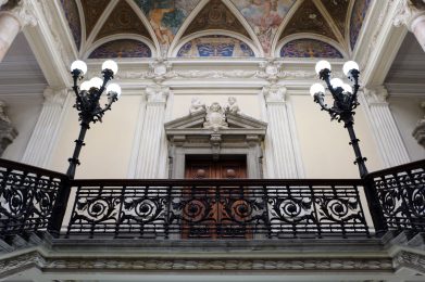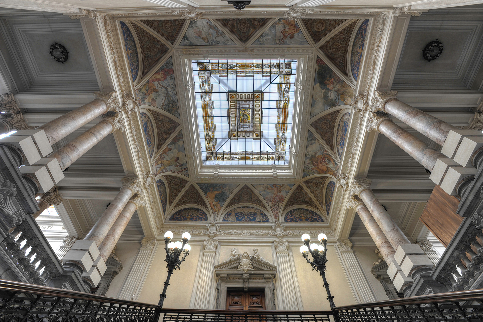 A polychrome glass panel illuminates the entrance stairs from above, the work of Galileo Chini, who also painted the twelve paintings on the ceiling arches that represent the allegories of good governance (Work, Build, Know, Prosper in Peace).